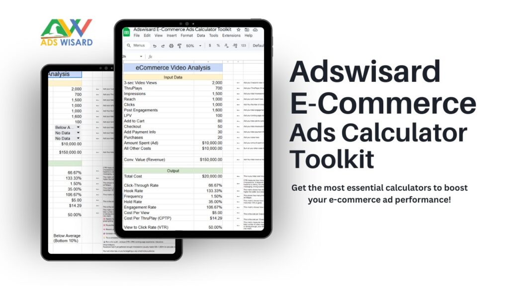 Streamline your ad campaign analysis with the Adswisard E-Commerce Ads Calculator Toolkit – a powerful Google Sheets template designed to simplify complex ad metrics. Whether you’re a social media advertiser, digital marketer, or entrepreneur with limited ad knowledge, this toolkit helps you effortlessly calculate key metrics like CAC, target revenue, and ad returns. Just input your data, and get clear results accompanied by helpful notes to make smarter decisions fast. Compatible with any device using Google Sheets and requires no technical setup!