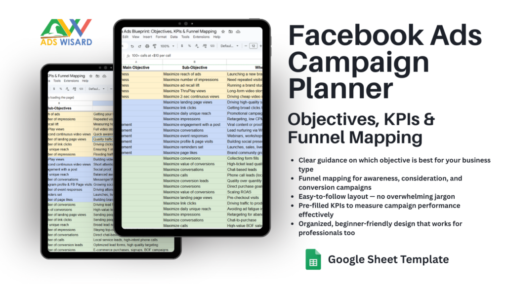 Facebook Ads Campaign Planner | Meta Ads Blueprint Google Sheets | Objectives, KPIs & Funnel Mapping